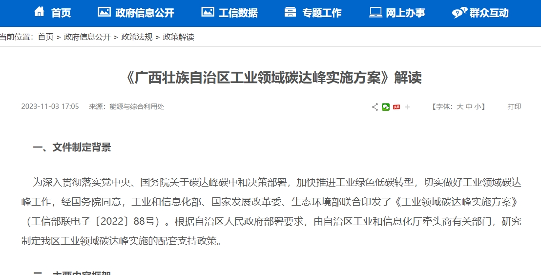 近日,廣西壯族自治區工業和信息化廳與廣西壯族自治區發展和改革委員會、廣西壯族自治區生態環境廳聯合印發了《廣西壯族自治區工業領域碳達峰實施方案》