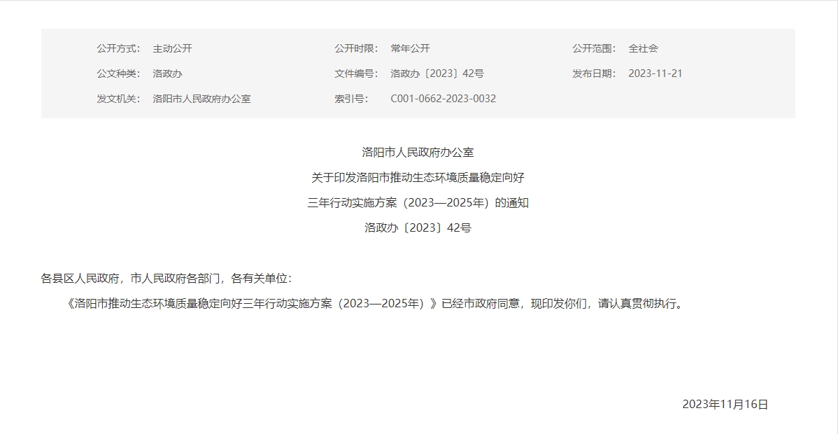 《洛陽市推動生態環境質量穩定向好三年行動實施方案(2023-2025年)》
