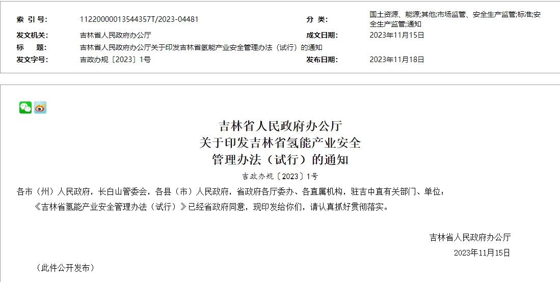氫啟未來網獲悉,11月18日,吉林省人民政府辦公廳發布關于印發《吉林省氫能產業安全管理辦法(試行)》的通知。