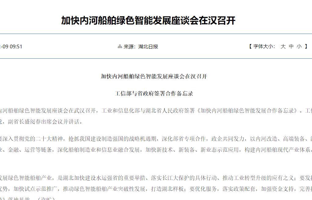 氫啟未來網獲悉,2月9日,加快內河船舶綠色智能發展座談會在武漢召開,工業和信息化部與湖北省人民政府簽署《加快內河船舶綠色智能發展合作備忘錄》。