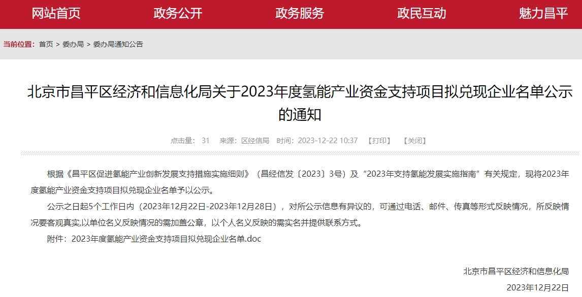 氫啟未來網(wǎng)獲悉,12月22日,北京市昌平區(qū)經(jīng)濟和信息化局根據(jù)《昌平區(qū)促進氫能產(chǎn)業(yè)創(chuàng)新發(fā)展支持措施實施細則》(昌經(jīng)信發(fā)〔2023〕3號)及“2023年支持氫能發(fā)展實施指南”有關(guān)規(guī)定,現(xiàn)將2023年度氫能產(chǎn)業(yè)資金支持項目擬兌現(xiàn)企業(yè)名單予以公示。