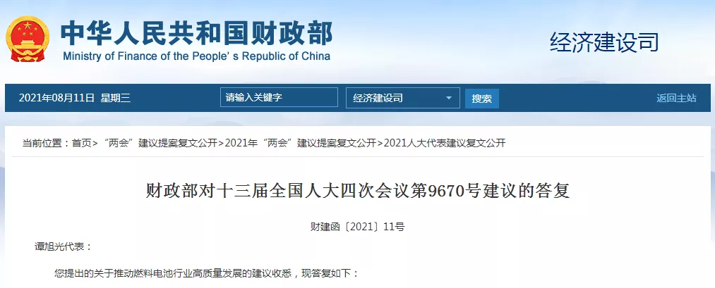 財政部近日對人大代表的建議提案進行了回復。在這些提案中,部分人大代表提出將山東省、成渝市、內蒙古包頭市納入燃料電池示范城市群的建議。