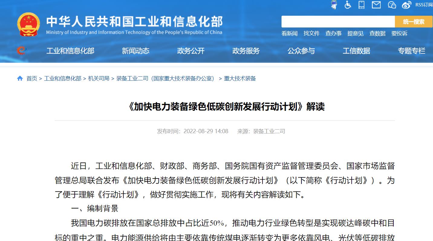 近日,工業(yè)和信息化部、財政部、商務(wù)部、國務(wù)院國有資產(chǎn)監(jiān)督管理委員會、國家市場監(jiān)督管理總局聯(lián)合發(fā)布《加快電力裝備綠色低碳創(chuàng)新發(fā)展行動計劃》(以下簡稱《行動計劃》)