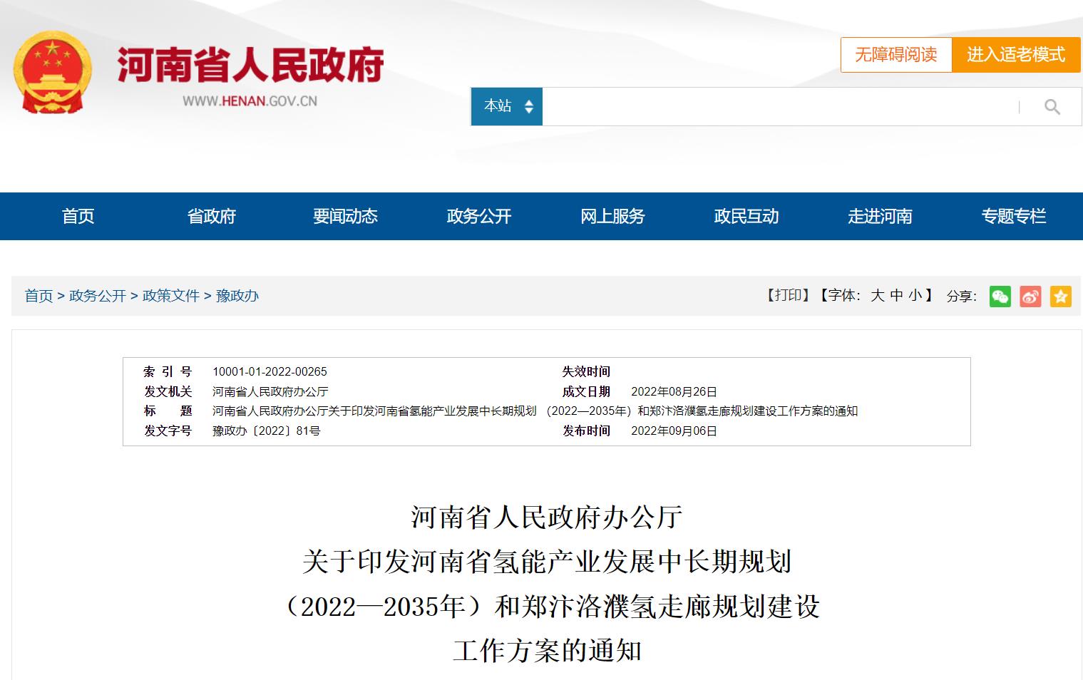 9月6日,河南省人民政府辦公廳發(fā)布關(guān)于印發(fā)河南省氫能產(chǎn)業(yè)發(fā)展中長期規(guī)劃(2022-2035年)和鄭汴洛濮氫走廊規(guī)劃建設(shè)工作方案的通知,其中河南省氫能產(chǎn)業(yè)發(fā)展中長期規(guī)劃(2022—2035年)原文如下