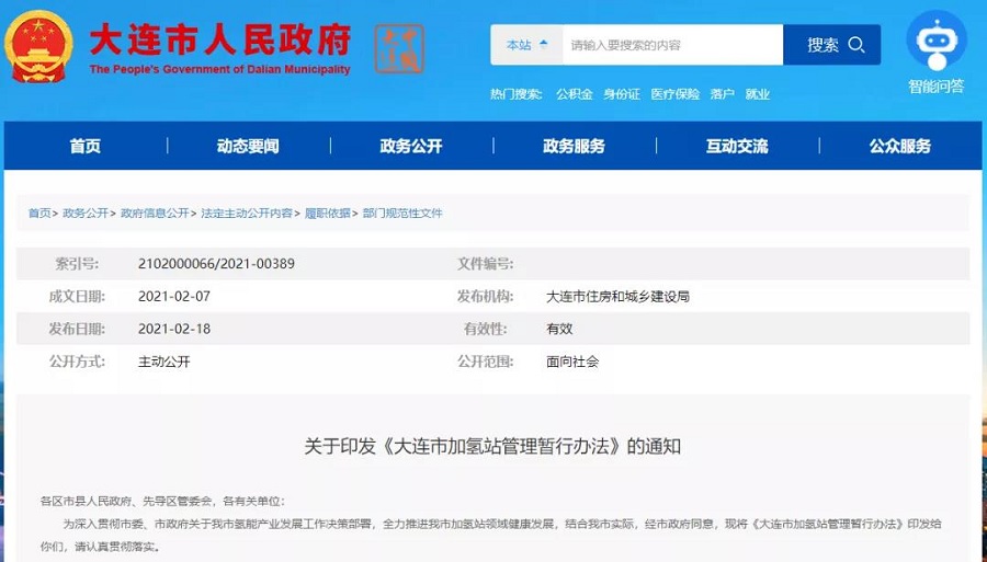 ?2月17日,大連市人民政府發布關于印發《大連市加氫站管理暫行辦法》的通知,有效期兩年。其中規定加氫站建設由大連市住房和城鄉建設管理局主管。