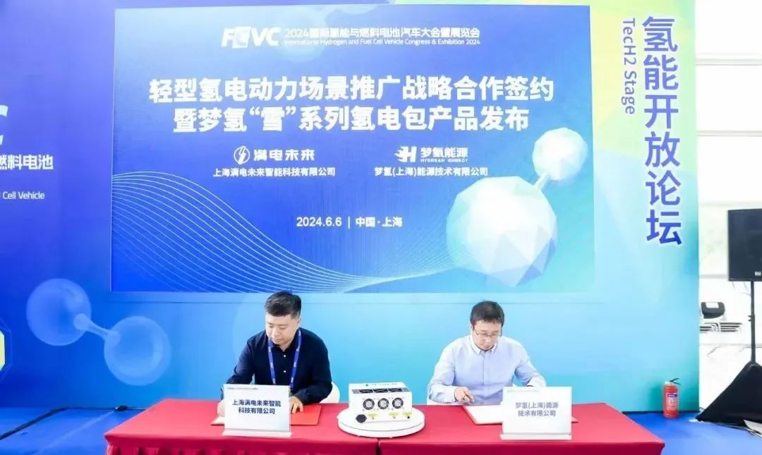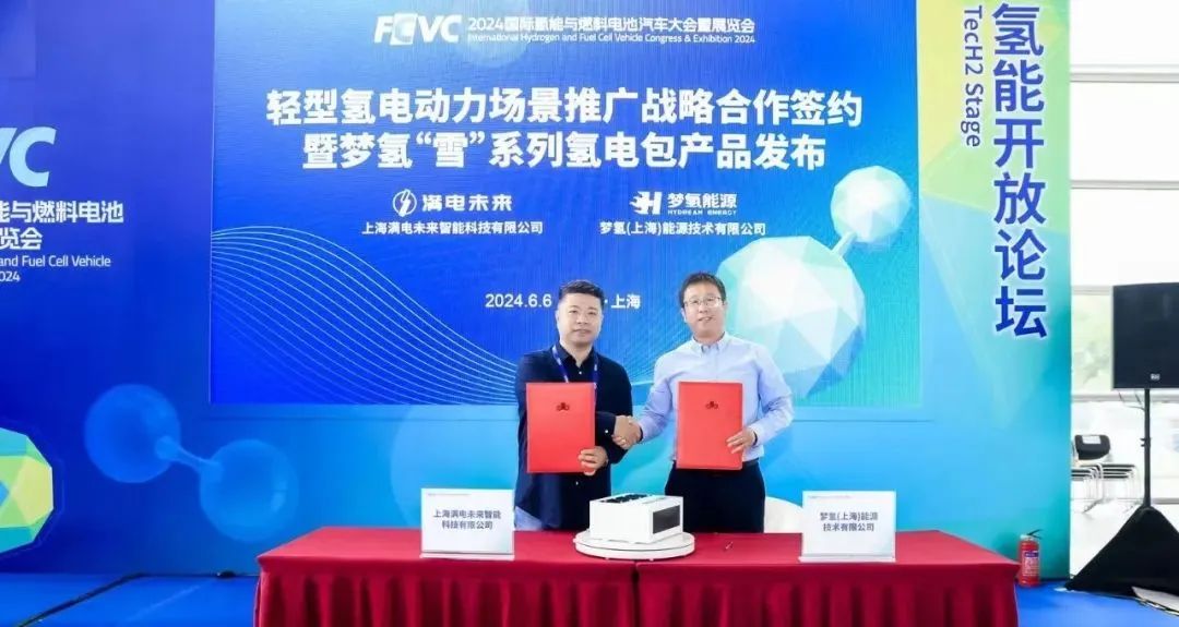 6月6日,在上海汽車會展中心召開的,由中國汽車工程學會與國際氫能燃料電池協會共同主辦的“2024國際氫能與燃料電池汽車大會暨展覽會(FCVC 2024)上,夢氫能源與滿電未來就輕型氫電動力應用場景推廣,進行了戰略合作簽約暨夢氫“雪系列”空冷氫電包發布會,夢氫能源董事長張亮和滿電未來執行總裁王強出席了簽約儀式。