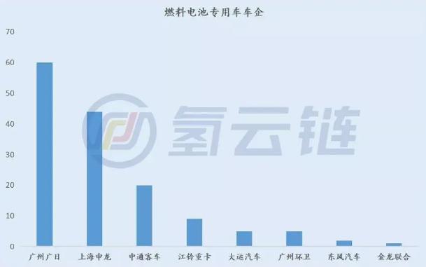 從各燃料電池車企分布來看,共有8家車企的燃料電池專用車在各地上險。其中,廣州廣日、上海申龍和中通客車都有超過20輛車上險,其中廣州廣日有60輛燃料電池專用車上險,占整個專用車上險量為41.1%,排名第一;上海申龍有40輛專用車上險,排名第二;中通客車20輛,排名第三;江鈴重卡有9輛車上險,排名第四;大運汽車、廣州環衛均有5輛車上險,并列第五;東風汽車、金龍聯合分別有2輛和1輛上險,排名緊隨其后。
