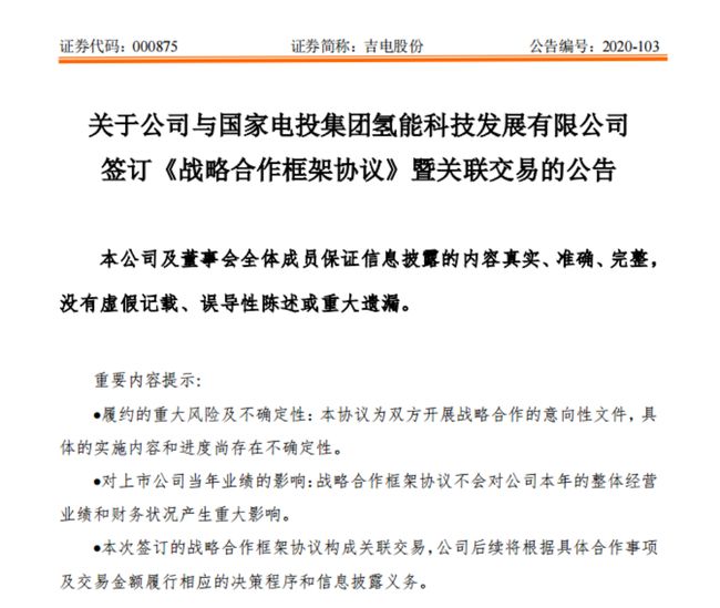 集微網(wǎng)消息,12月23日晚間,吉電股份公告,公司與國(guó)家電投集團(tuán)氫能科技發(fā)展有限公司(簡(jiǎn)稱(chēng)“氫能科技”)簽署了《戰(zhàn)略合作框架協(xié)議》。