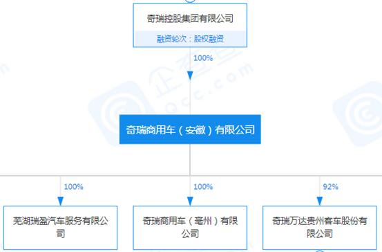 股權結構顯示,奇瑞萬達是奇瑞商用車(安徽)有限公司的控股子公司,而奇瑞商用車則是奇瑞控股旗下的全資子公司。
