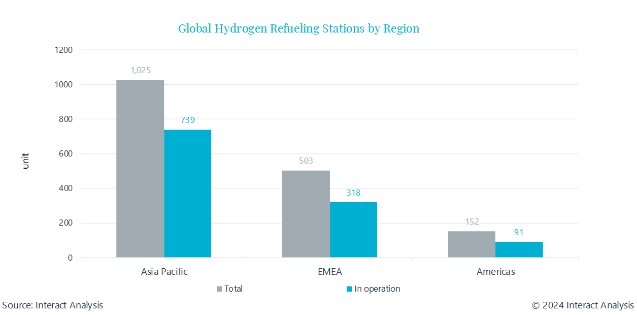 近年來,隨著氫能交通應用的推廣落地,加氫站建設日益緊迫。Interact Analysis 持續追蹤全球加氫站部署,據統計,截至2024年上半年,全球加氫站部署達到1,680座(含建成、在建及規劃),其中1,148座已建成投運。
