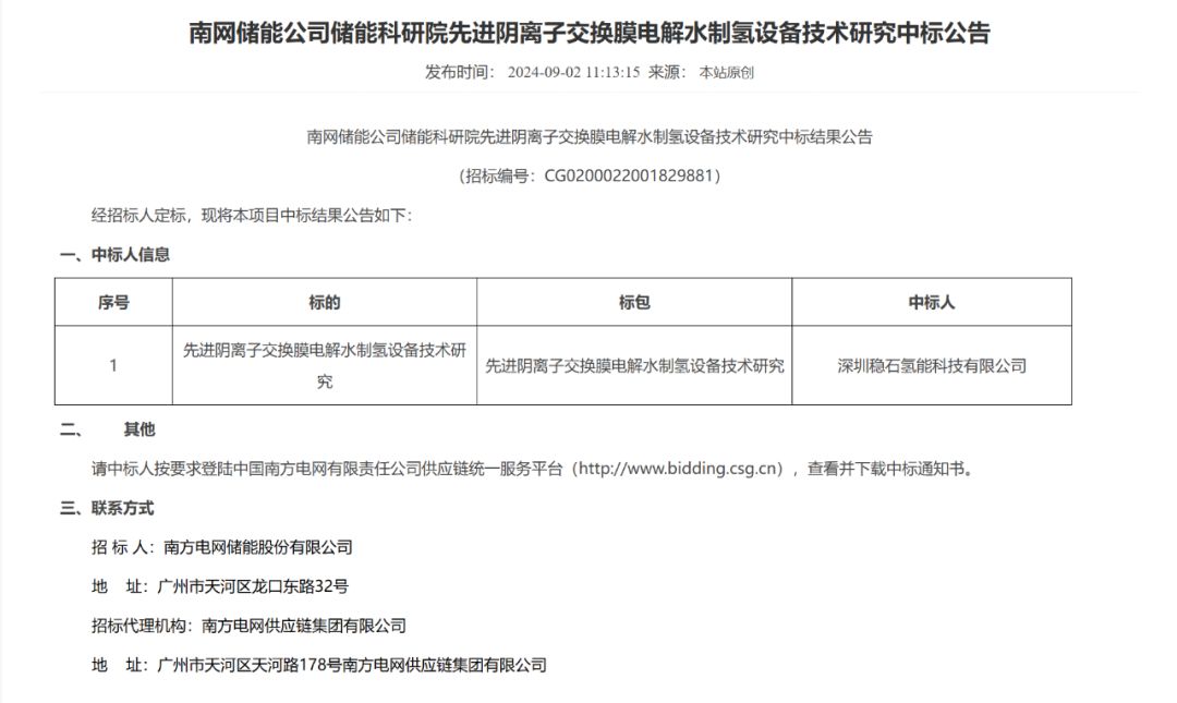 2024年9月2日,深圳穩(wěn)石氫能科技有限公司正式中標全球首套單系統(tǒng)1.25MW-AEM(陰離子交換膜)電解水制氫項目,刷新了目前全球最大單系統(tǒng)功率AEM制氫項目的記錄,同時也開啟了國內(nèi)兆瓦級AEM商業(yè)化應用示范,這標志著AEM電解水制氫技術的產(chǎn)業(yè)化進入了新的階段。