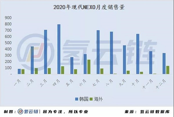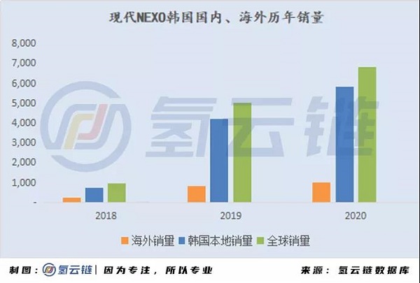 現代NEXO是韓國氫能汽車產業的產業名片,NEXO作為燃料電池汽車的后起之秀,三年累計銷售燃料電池汽車12717輛,其中韓國本土累計銷售10707輛海外累計銷售2010輛。