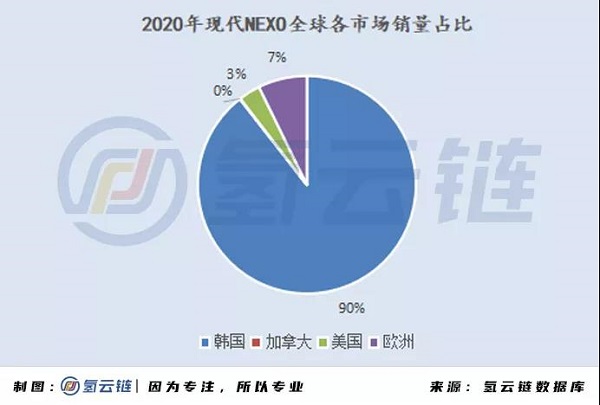 2020年現代NEXO全球銷量為6781,其中5786輛銷往韓國本土地區,韓國銷量的占比達到90%;剩余的995輛是銷售韓國以外的市場,其中,加拿大最少,美國200多輛。歐洲超過400輛,包括銷往瑞士的50輛X cient現代氫能卡車已經交付完畢。