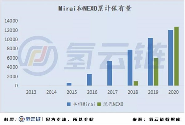 氫云鏈數據庫顯示,在燃料電池乘用車品牌中,豐田Mirai和現代NEXO占據絕對的主導地位。豐田作為先行者,于2014年開始銷售燃料電池汽車,現代的NEXO則為后起之秀,在2018年開始上市銷售于19年銷量超過Mirai并在2020年在燃料電池保有量和銷售量上都超過豐田Mirai成為第一。