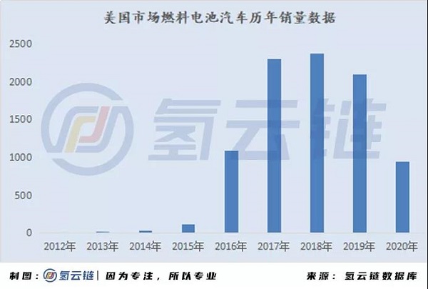氫云鏈數據庫顯示,截至2020年末,美國市場累計銷售氫燃料電池汽車8931輛。2020年美國市場累計銷售氫能汽車937輛,受疫情原因,較去年下滑55%。從歷年銷量數據來看,2018年銷售2368輛達到近年高點。