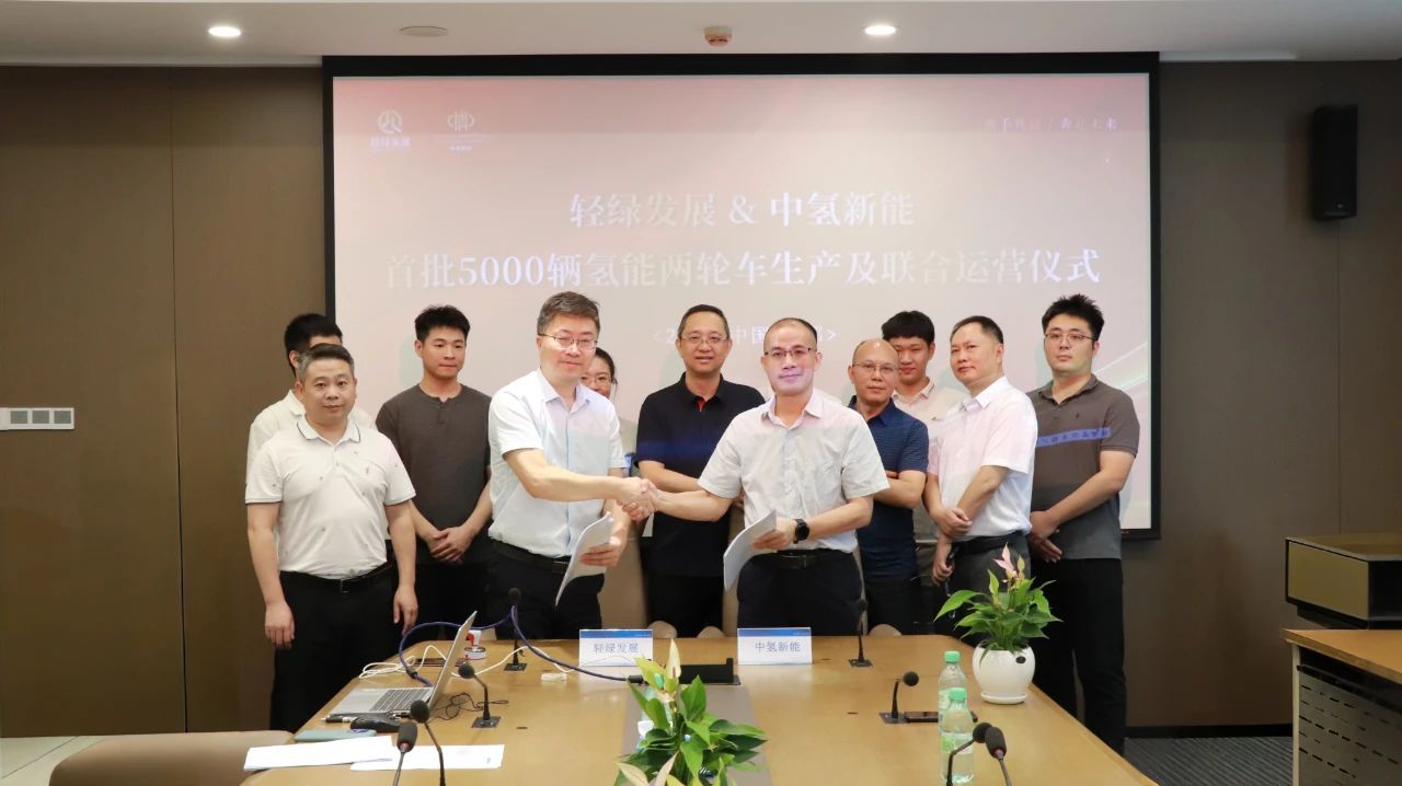 近日,中氫新能裝備制造(北京)股份有限公司與四川輕綠氫能源發展有限公司(以下簡“輕綠發展”)在四川省成都市舉辦首批5000輛氫能兩輪車生產及聯合運營儀式。中氫新能董事長周明強、裝備公司總經理石明華,四川輕綠氫能源發展有限公司董事長肖天林、總經理魏明用等領導共同為氫車生產及聯合運營儀式揭幕并簽署合作協議。中氫新能將以其先進的“技術研發+裝備制造”能力與輕綠發展豐富的市場運營實力深度融合,攜手打造城市氫能運營服務新模式,推動氫能兩輪車規?;?、市場化、產業化發展。
