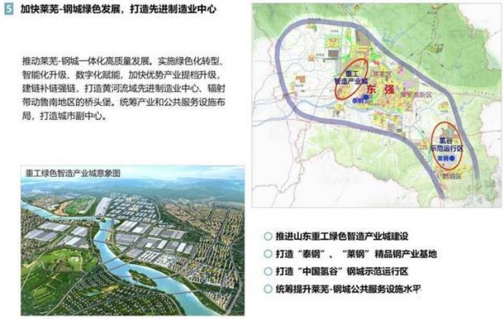 方案明確了“東強(qiáng)”發(fā)展的八大重點(diǎn)板塊,其中第五板塊為加快萊蕪—鋼城綠色發(fā)展,打造先進(jìn)制造業(yè)中心。推動(dòng)萊蕪-鋼城一體化高質(zhì)量發(fā)展。實(shí)施綠色化轉(zhuǎn)型、智能化升級(jí)、數(shù)字化賦能,加快優(yōu)勢(shì)產(chǎn)業(yè)提檔升級(jí),建鏈補(bǔ)鏈強(qiáng)鏈,打造黃河流域先進(jìn)制造業(yè)中心、輻射帶動(dòng)魯南地區(qū)的橋頭堡。統(tǒng)籌產(chǎn)業(yè)和公共服務(wù)設(shè)施布局,打造城市副中心。