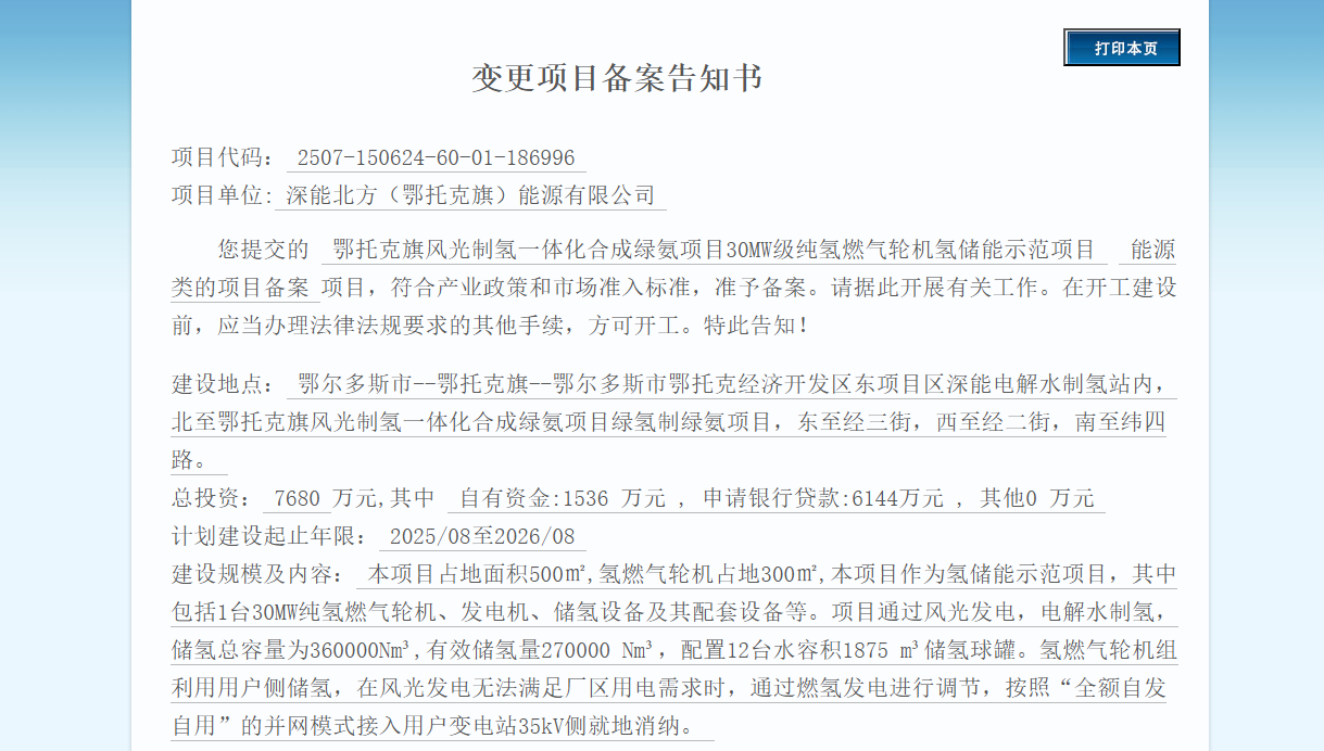 近日,鄂托克旗風光制氫一體化合成綠氨項目30MW級純氫燃氣輪機氫儲能示范項目變更備案。項目建設內容新增360000Nm3儲氫部分。