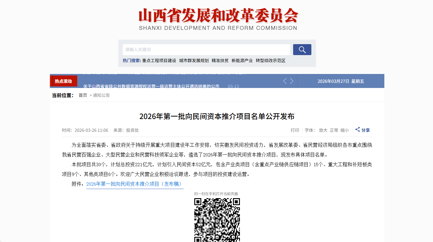 [ 導讀 ]3月26日,山西省發展和改革委發布2026年第一批向民間資本推介項目名單。本批項目共30個,計劃總投資221億元,計劃引入民間資本52...
