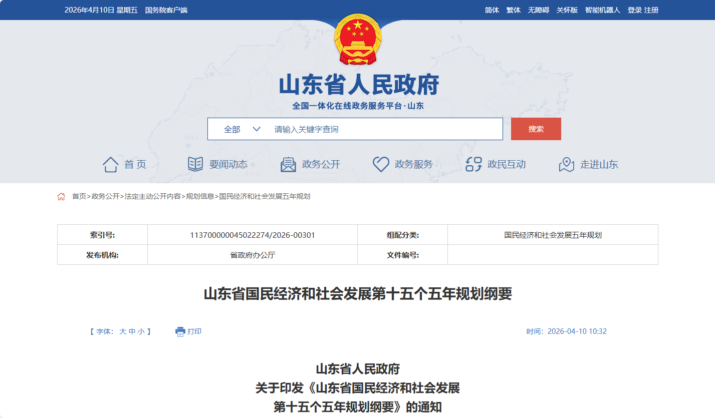 4月10日,山東省人民政府發布《山東省國民經濟和社會發展第十五個五年規劃綱要》(以下簡稱“《綱要》”),系統總結山東省“十四五”時期發展成就,全面闡述“十五五”時期發展戰略、總體目標、主要任務和重要舉措。