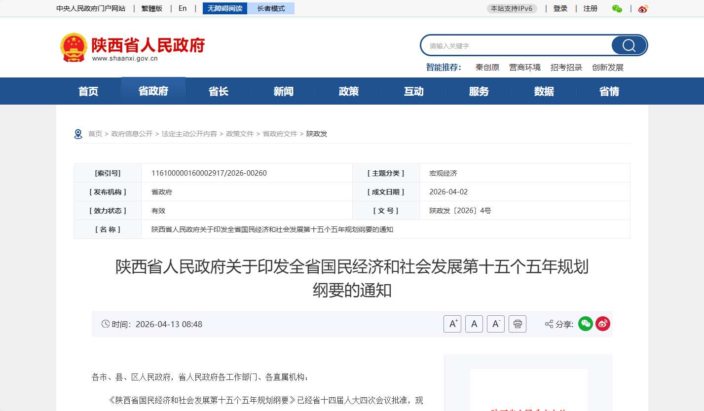 4月13日,陜西省人民政府發布《陜西省國民經濟和社會發展第十五個五年規劃綱要》(以下簡稱“《綱要》”),主要闡明“十五五”時期全省發展的戰略目標和重點任務,明確政府工作重點,引導規范經營主體行為。