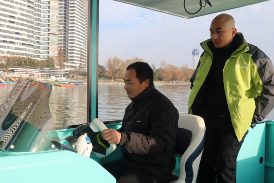 隨著游艇操作臺上的屏幕逐漸亮起,顯示著“燃料電池與氫瓶已經(jīng)成功連接,測試正常,可以下水”的消息。船尾處的氫燃料電池開始運轉,推動游船緩緩離開水岸。與此同時,氫電與鋰電的混動系統(tǒng)展現(xiàn)出其多功能的特點,不僅能為游船提供在水中行駛的動力,還能同時支持燒水壺、音箱和船身燈光等設備的用電需求。