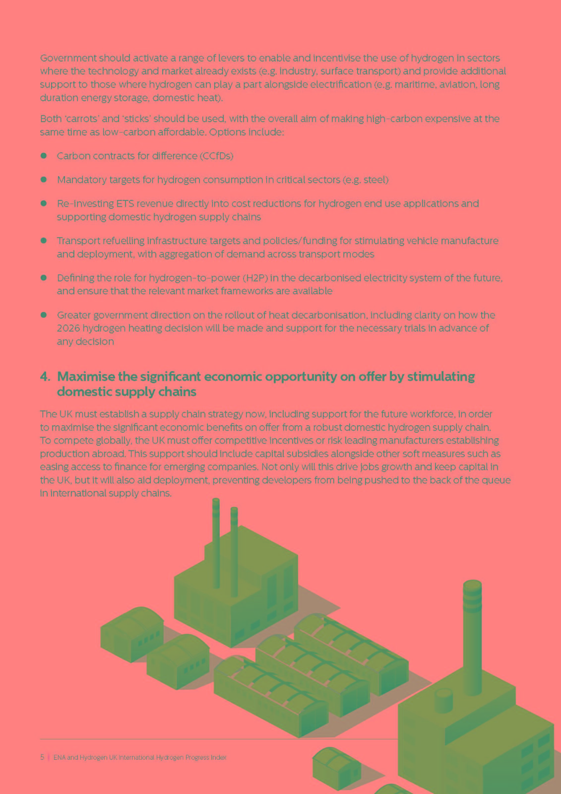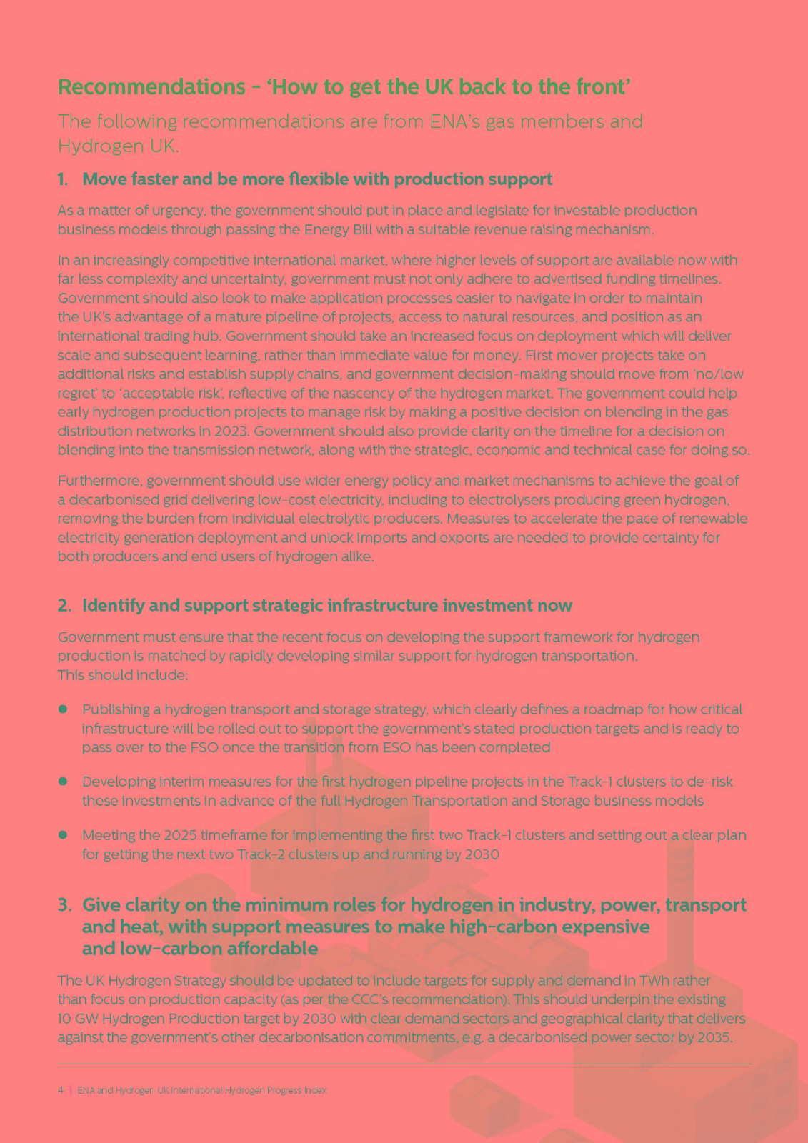 報告指出:“危險在于,英國將無法建立健全的國內供應鏈,被迫排在國際供應商的后面,從而進一步減緩部署和脫碳努力,錯失由此帶來的經濟效益。”ENA和Hydrogen UK的成員建議英國在生產支持方面采取更快、更靈活的行動,并表示:“作為一項緊急事項,政府應該通過《能源法案》,制定可投資的生產商業模式,并建立適當的收入增加機制?!?/span>