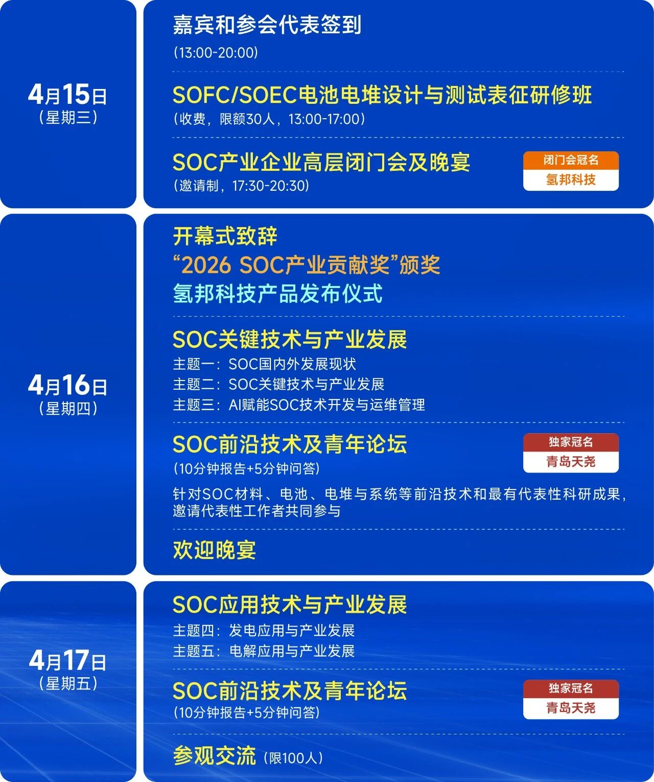 然而,當前SOC技術仍存在壽命與一致性亟需提升、產業規?;∨c成本高等問題,產業鏈尚未完全成熟,商業化推廣面臨挑戰。為了推動固體氧化物電池產學研協同發展,加快產業化規模化應用,由DT新能源主辦,天府永興實驗室聯合主辦,西南石油大學、全省先進燃料電池與電解池技術重點實驗室、江蘇省可再生能源學會燃料電池專委會、雅安雅瓷氫化新能源科技發展有限公司協辦的2026(第六屆)固體氧化物電池技術發展與產業論壇將于2026年4月15-17日在四川成都舉辦。本屆論壇以“邁向SOC規?;闾紩r代”為主題,邀請各大高校、科研院所、產業鏈上中下游代表性企業,對SOC產業中短期突破和長期發展作充分探討,加速打通產業鏈,為雙碳目標下的能源結構轉型貢獻力量。