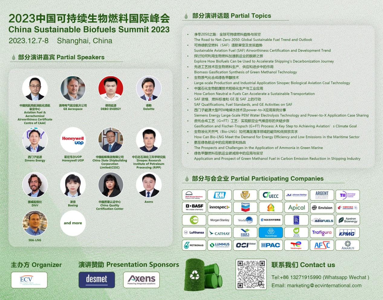由上海希為(ECV International)主辦的“2023中國可持續(xù)生物燃料國際峰會”即將于2023年12月7日-8日在上海拉開帷幕,峰會采用“線下+線上”的方式同步進行,中英雙語同聲傳譯,線上、線下并行進行和實時互動。歡迎咨詢、運輸行業(yè)、氫化植物油/低碳燃料、可持續(xù)航空燃料/生物航煤、可再生原料、生物燃料/生物柴油、合成燃料、電子燃料、液化和氣化解決方案、催化解決方案、轉(zhuǎn)化工藝、精煉解決方案、預(yù)處理和凈化解決方案、工程解決方案、石油和天然氣、能源和石化等行業(yè)領(lǐng)域的利益相關(guān)者報名出席峰會。