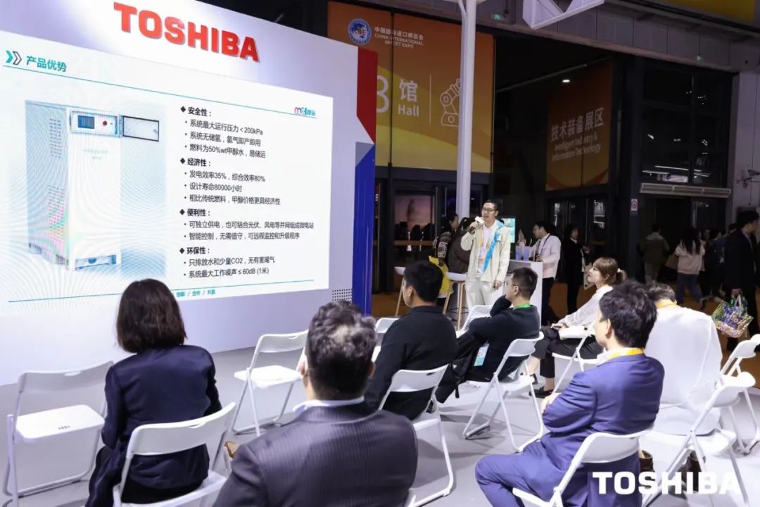 11月5日至10日,摩氫科技與東芝公司的合作產品甲醇氫能發(fā)電機亮相第六屆中國國際進口博覽會。本屆進博會全面恢復線下舉辦,技術裝備展區(qū)因其展品科技含量高是人氣最高的展區(qū),集中展示了行業(yè)綠色低碳、數字智能等方面的最新成果,甲醇氫能發(fā)電機作為跨越油機時代的綠色動力成為本屆技術裝備展區(qū)的明星展品。