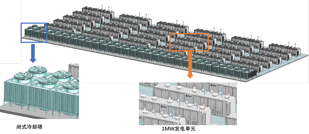 1MW發電單元由5個200kW模塊組成,并結合消防系統、逆變系統等組成單個的發電單元。