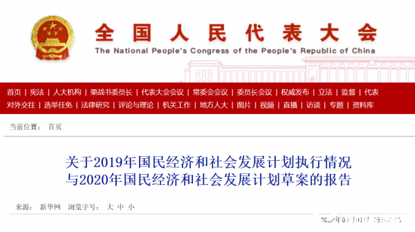 2020年06月01日,中國人大網公布《關于2019年國民經濟和社會發展計劃執行情況與2020年國民經濟和社會發展計劃草案的報告》。該報告由國家發展和改革委員會在今年全國兩會期間提請十三屆全國人大三次會議審議后的最終版本。