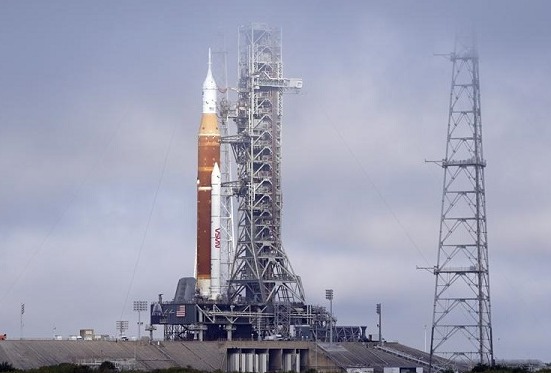 搭載獵戶座飛船的NASA Artemis火箭站在佛羅里達州卡納維拉爾角肯尼迪航天中心。