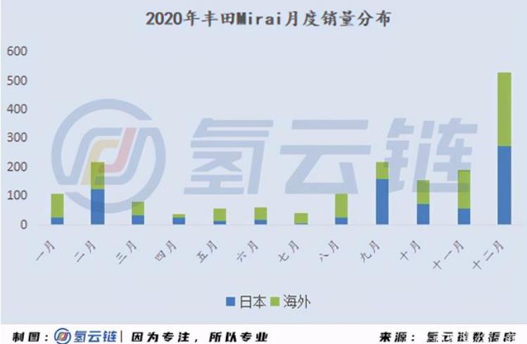從2020年月度數(shù)據(jù)看,Mirai在日本本國和在海外的銷量分別為789和981輛。下半年的銷量明顯好于上半年,12月是全年的銷售高峰,達到了527輛。海外是豐田Mirai的主要要銷售地區(qū)。