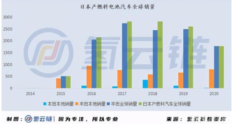 2020年日本市場共銷售797輛燃料電池汽車,主要為豐田Mirai銷售的789輛。2016年日本的燃料電池銷量達到頂峰,年銷售1055輛,隨后四年有所下滑。