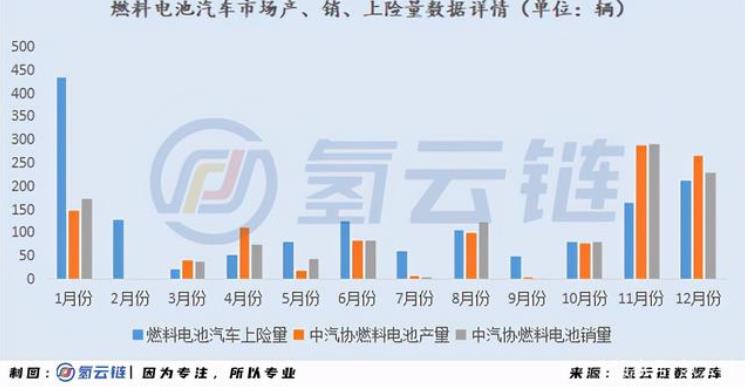 中國沒有燃料電池乘用車量產銷售,氫燃料電池汽車市場主打是商用車。截止2020年底,我國燃料電池汽車市場產、銷、上險量分別為:1199、1179、1499,保有量為7355。根據(jù)下圖可見,2020年燃料電池汽車的產、銷、上險量三個數(shù)據(jù)整體變化趨勢基本保持一致。