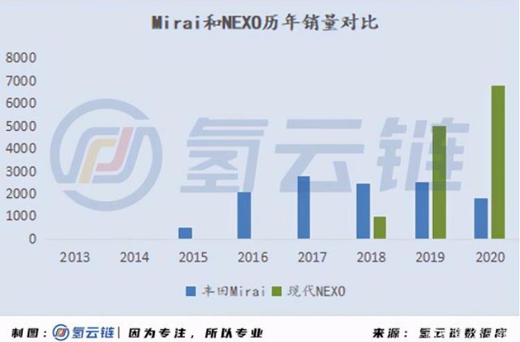 氫云鏈數(shù)據(jù)庫顯示,在燃料電池乘用車品牌中,豐田Mirai和現(xiàn)代NEXO占據(jù)絕對的主導地位。豐田作為先行者,于2014年開始銷售燃料電池汽車,現(xiàn)代的NEXO則為后起之秀,在2018年開始上市銷售于19年銷量超過Mirai并在2020年在燃料電池保有量和銷售量上都超過豐田Mirai成為第一。