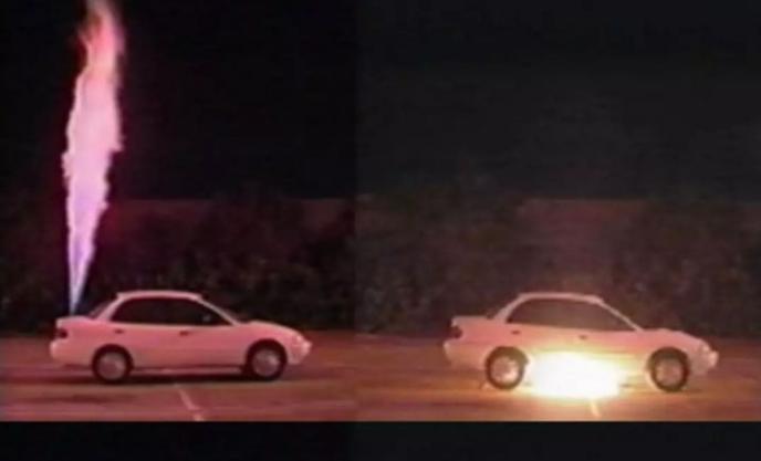 圖2顯示了氫燃料汽車(左)和汽油車(右)的燃料箱,通過(guò)破壞性點(diǎn)燃方式所獲得的經(jīng)驗(yàn)。