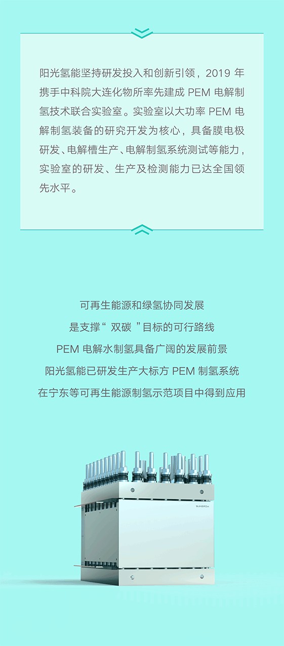 可再生能源和綠氫協同發展是支撐“雙碳”目標的可行路線,PEM電解水制氫具備廣闊的發展前景,陽光氫能已研發生產大標方PEM制氫系統,在寧東等可再生能源制氫示范項目中得到應用。