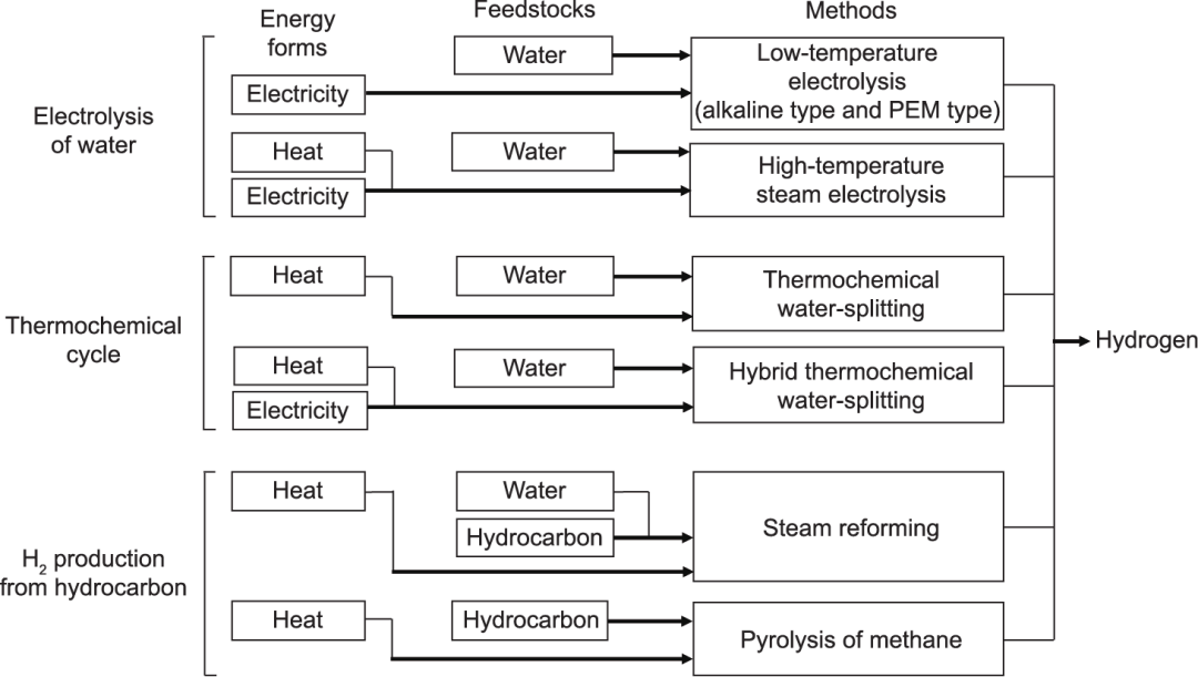 由于低溫水電解法可以僅由電能驅(qū)動(dòng),因此可以使用輕水反應(yīng)器、快中子增殖反應(yīng)器或高溫氣冷反應(yīng)器作為能源。高溫蒸汽電解所需的水汽化熱(i)也可以由輕水反應(yīng)堆、快中子增殖反應(yīng)堆或高溫氣冷反應(yīng)堆提供。