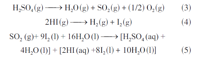 其中,“aq”表示水溶液。反應(yīng)(3)是硫酸(H2SO4)分解反應(yīng),在氣相中熱分解H2SO4產(chǎn)生氧氣,反應(yīng)(4)是碘化氫(HI)分解反應(yīng),在氣相中熱分解HI產(chǎn)生氫氣。反應(yīng)(5)稱為本生反應(yīng),是水、二氧化硫和碘反應(yīng)生成硫酸和HI的一種液相反應(yīng)。本生反應(yīng)中產(chǎn)生的H2SO4和HI可以通過(guò)液-液相分離現(xiàn)象分離為上層液相和下層液相。