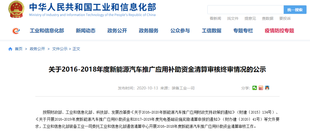 近日,工信部正式對外發布關于2019年度新能源汽車推廣應用補助資金清算審核終審情況及2016-2018年度申訴車輛復審情況的公示。