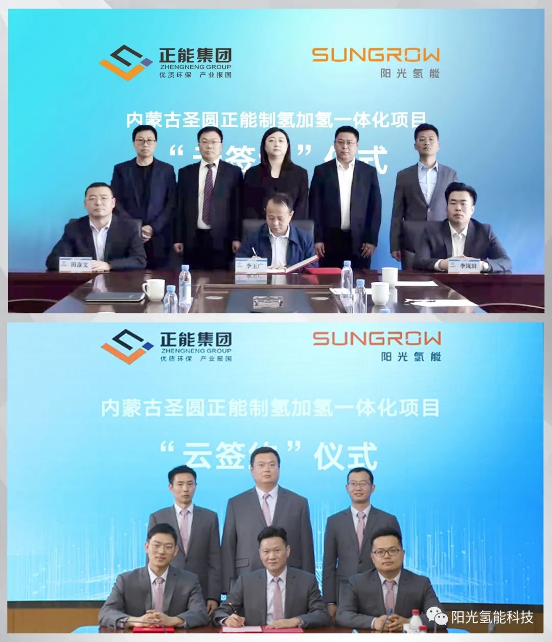 3月31日,陽光氫能與正能集團(tuán)舉行合作協(xié)議“云簽約”儀式,深化“綠電+綠氫”領(lǐng)域合作,共同打造“內(nèi)蒙古圣圓正能制氫加氫一體化項目”。正能集團(tuán)副董事長李玉廣、常務(wù)副總田彥文、圣圓伊政新能源總經(jīng)理王馨、正能氫能源科技有限公司總經(jīng)理李嵐田等領(lǐng)導(dǎo),陽光電源副總裁兼氫能事業(yè)部總裁程程、氫能事業(yè)部營銷總經(jīng)理方偉等領(lǐng)導(dǎo)出席“云簽約”儀式。