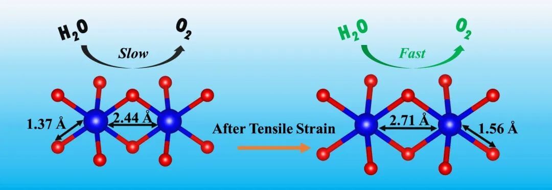 團隊采用金屬錳替代磷酸鈷中部分鈷,顯著增強了磷酸鈷的電催化OER性能。擴展邊X射線精細結構(EXAFS)和原位Raman實驗表征發現,錳元素的引入可使得磷酸鈷晶格發生拉伸應變,有利于*OH的吸附以及催化劑表面快速重構為高催化活性的羥基氧化鈷,從而提升了電催化OER性能。相關工作發表在《Journal of Colloid and Interface Science》,2021級碩士生徐欣玥為論文第一作者,陳翔博士、柳東明教授和南京郵電大學朱先軍副教授為論文共同通訊作者。