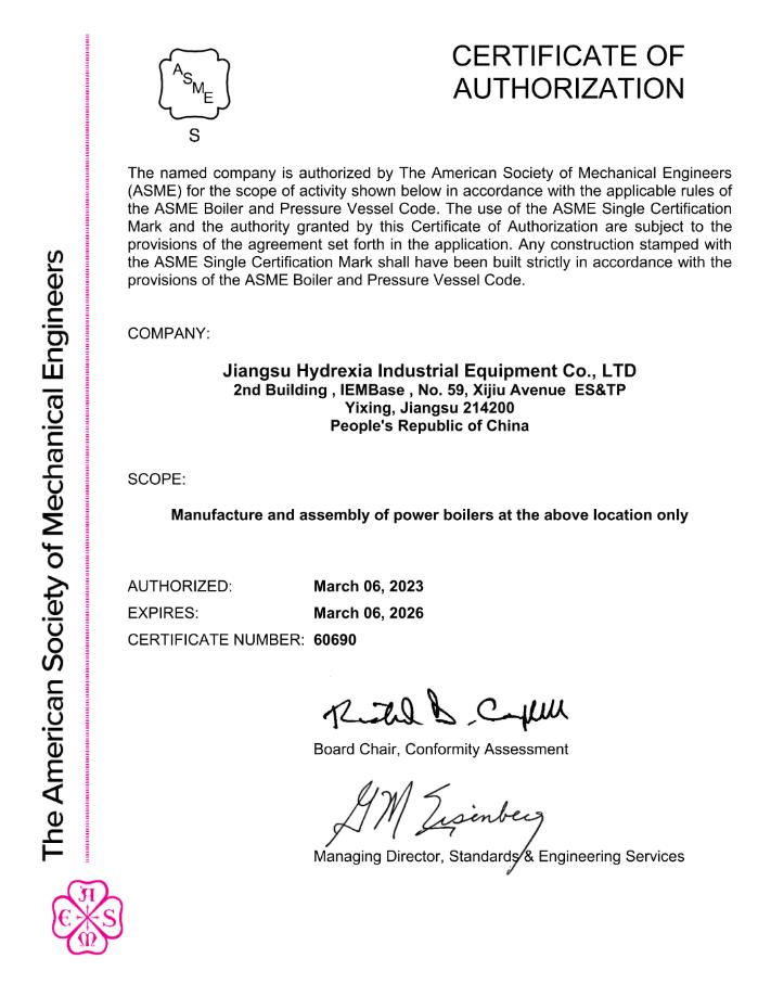 2023年3月,氫楓集團(tuán)的宜興生產(chǎn)基地順利通過了ASME取證聯(lián)檢工作,并取得了“S+U+U2”ASME鋼印證書。此次通過ASME資質(zhì)認(rèn)證,標(biāo)志著集團(tuán)動(dòng)力鍋爐及壓力容器裝備質(zhì)量保證體系得到了國際權(quán)威機(jī)構(gòu)的認(rèn)可,集團(tuán)裝備生產(chǎn)能力擴(kuò)大,質(zhì)量管理水平和技術(shù)水平進(jìn)一步提升。