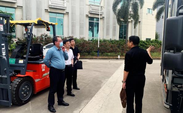 在園區(qū),章志強董事長一行興致勃勃地參觀了公司已投入運營的4.5噸氫燃料電池廂式物流車和3.5噸氫燃料電池叉車。