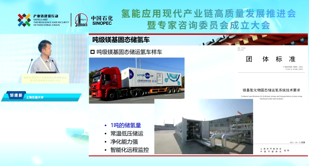 在會議的中央企業產業鏈沙龍環節,氫楓能源首席科學家、上海交通大學氫科學中心副主任鄒建新教授與在場領導及專家們交流了高容量鎂基固態儲運氫技術進展。目前,氫楓能源聯合上海交通大學氫科學中心已成功實現該技術的實際落地,研發生產的第一代鎂基固態儲運氫車(MH-100T)單車儲氫量可達1噸,為氫能的大規模多場景應用創造了更多可能性。同時,氫楓還在進一步研發適配小場景用氫需求的鎂基固態儲氫單體,通過可自由擴展組合的小型儲氫單元,拓展備用電源、分布式儲能等應用場景。