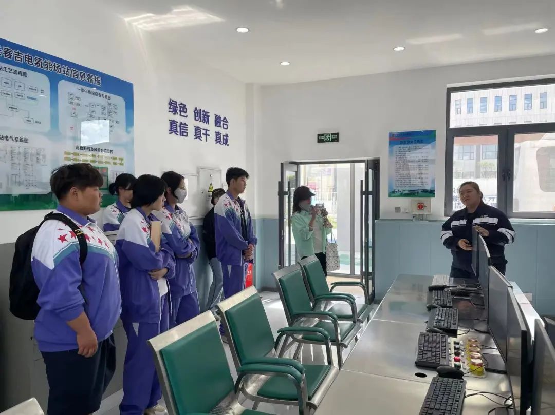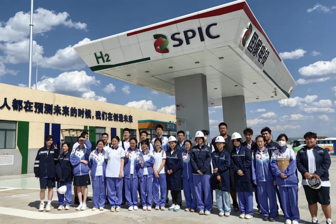參觀過程中,同學們嚴格遵守現場安全規程,時刻保持現場秩序。該公司結合目前氫能產業現狀,詳細介紹了公司在吉林省內的氫能產業布局,以及對國內、外市場氫基綠色能源的長期戰略規劃。隨后,現場技術人員對國家電投自主研發制造的PEM制氫設備以及創新打造的前站后廠式“可再生能源+PEM制氫+加氫”一體化運作模式進行詳細講解,充分展示了公司推動氫能產業發展取得的顯著成效。值得一提的是,本次參觀同學們全程乘坐氫能大巴往返市區,切身實地感受氫能的“魅力”。