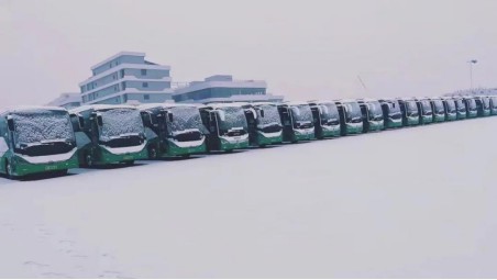 圖 |冰雪覆蓋下,嚴陣以待的宇通牌氫能客車