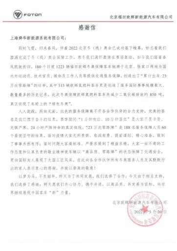 冬奧會后我們陸續收到來自多家客戶的感謝信,上海舜華新能源系統有限公司保供專班服務人員技術專業、快速響應、高效服務,圓滿地完成了賽事保障工作,贏得了客戶的認可。